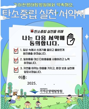 국립공원공단 가야산생태탐방원(원장 지인주)은 탐방원 이용객들을 대상으로 지난 22일부터 2주간 ‘탄소중립 실천서약 이벤트’를 진행한다고 밝혔다.탄소중립 실천서약 이벤트는 가야산생태탐방원 프로그램 또는 숙박시설을 이용하는 이용객이 ‘탄소중립 실천서약서’를 작성 후 인증하면 국립공원 굿즈를 제공하는 이벤트이다.특히 SNS 추가 인증자의 경우 다른 국립공원 굿즈를 추가로 제공하여 이용객들의 많은 호응을 예상하고 있다. 자세한 사항은 가야산생태탐방원 인스타그램(@gayasan_nature_center) 또는 탐방원 게시판에서 확인할 수 있