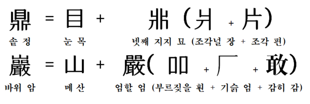 솥 정(鼎)은 目(눈 목)에 戼(넷째 지지 묘)로 이뤄진 한자이다. 目(눈 목)은 사람의 눈 모양을 본뜬 글자로 처음에는 가로로 섰으나 나중에는 세로로 고쳐 썼다. 목격(目擊 : 직접 자기의 눈으로 봄), 목례(目禮 : 눈으로 인사함)가 좋은 용례이다. 戼(넷째 지지 묘)는 조각널 장(爿), 조각 편(片)으로 나눌 수 있다.