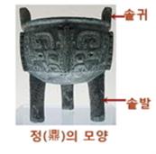 고대에서 제사나 국가 의식용 기물로 사용된 정(鼎)을 갑골문에는 세 개의 다리와 두 개의 손잡이가 달린 청동솥 모습을 형상화했고, 설문해자에서는 [三足兩耳, 和五味之寶器也 : 세 다리와 두 귀, 오미를 조화롭게 만드는 보배 그릇]으로 정을 세 개의 솥발과 두 개의 솥귀를 가졌으며, 다섯 가지 맛을 조화롭게 만드는 솥으로 설명해 왕권과 사회 안정의 상징으로 여겨졌다.