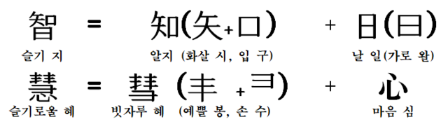 덧붙여 智자는 日(해 일)자가 부수이지만, 사실 말씀 왈(曰)자가 쓰인 것이다. 다시 말해 슬기 지(智)자는 ‘화살(矢)이 순식간에 구멍(口)을 통과하듯이 말(曰)을 잘한다’라는 뜻으로 만들어졌다. 말을 잘하려면 지식이나 지혜가 있어야 한다. 그래서 智자는 ‘아는 것이 풍부해 말함에 거침이 없다’라는 의미에서 지혜를 뜻하게 된다.