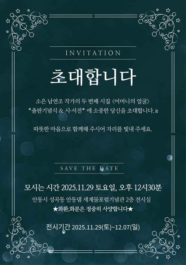 안동에서 활동하는 소은 남연조 작가가 두 번째 시집 『어머니의 얼굴』 출간을 기념하여 “출판기념식과 시·서전을 개최한다. 따뜻한 감성과 시적 울림으로 독자들의 마음을 사로잡아 온 소은 남연조 작가는 이번 행사에 소중한 이들을 초대하며 뜻깊은 자리를 마련한다.
