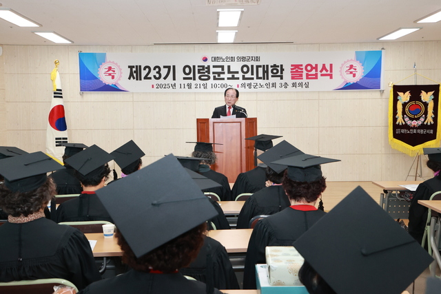 의령군노인대학(학장 하만용) 제23기 졸업식이 지난 21일 노인회 3층 회의실에서 65명의 졸업생과 오태완 군수, 김규찬 군의회의장을 비롯한 군의원, 기관단체장 등 100여 명이 참석한 가운데 성황리에 열렸다.