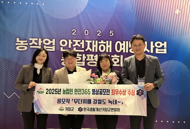 거창군은 지난 20일 농촌진흥청이 주최한 ‘2025년 농작업 안전재해 예방사업’ 종합 평가회에서 안전 365 캠페인 영상공모전에 한국생활개선거창군연합회(회장 윤진미)와 관의 협력으로 만든 영상이 최우수상을 수상했다고 밝혔다.